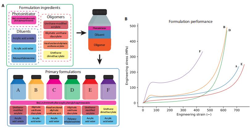 具体而言,关于基本成分和材料配方,研究人员首先生成了一组相互兼容的光固化初级配方,以混合并具有不同的机械性能,当然,他们并不是从头开始开发打印材料,而是首先确定了八种商用配方成分(包含一种光引发剂、三种稀释剂和四种低聚物),然后,六种主要配方(A 至 F)由库中的八种主要成分组成。