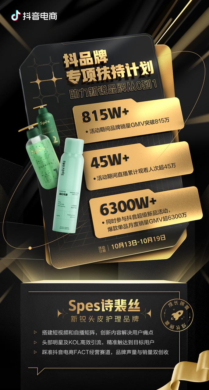 在“抖音超级新品”活动中,抖音电商就为入选的Spes免洗蓬松喷雾提供了全链式助力,包括流量扶持、达人种草带货、官方推介、抖音站内外宣发资源等等,几乎对Spes诗裴丝实施了24小时的在线助推。