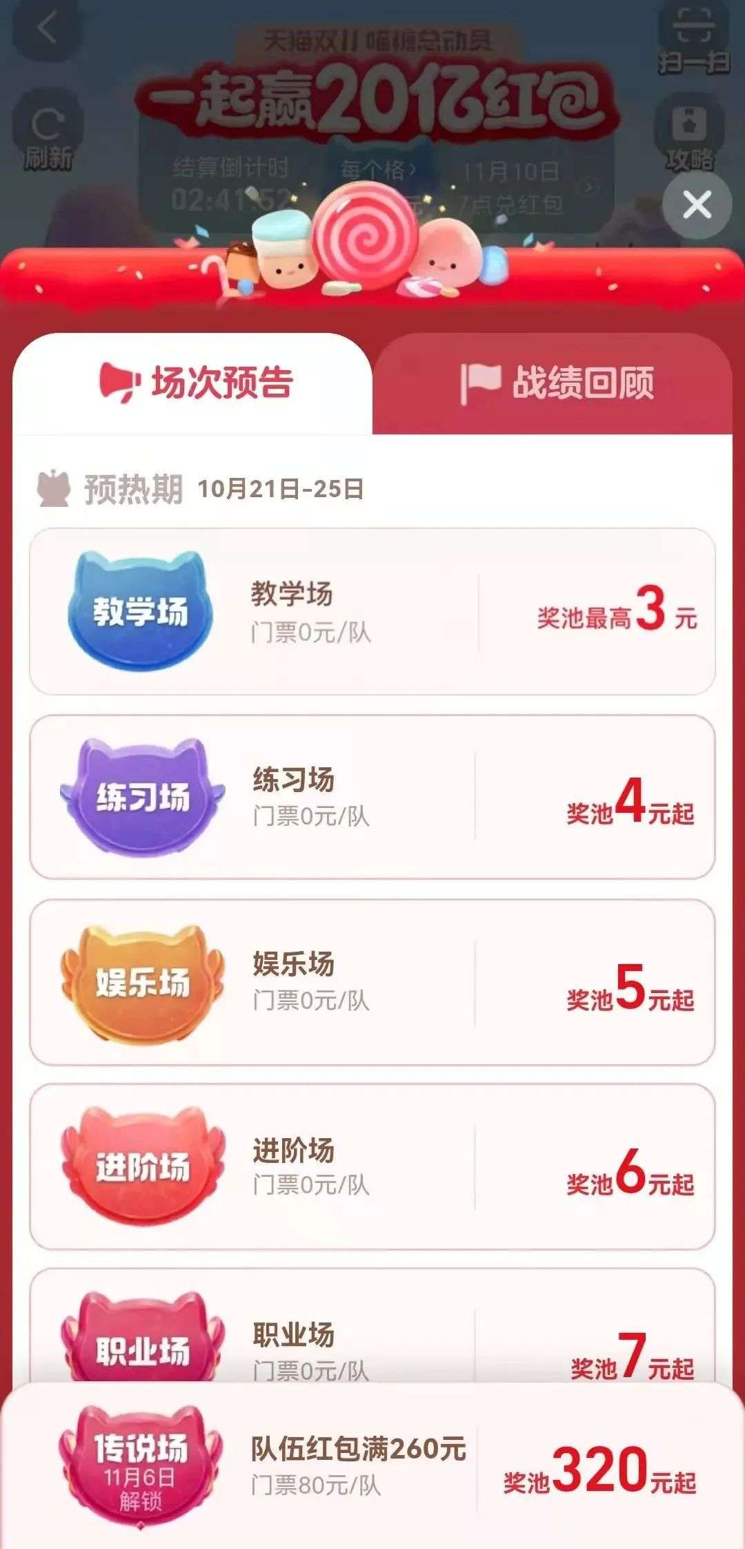 门票场场价格不等,免费参与,可以进入最高7元的奖池;如果买80元的门票,就能参加最高等级的传说场,奖池最高金额320元。