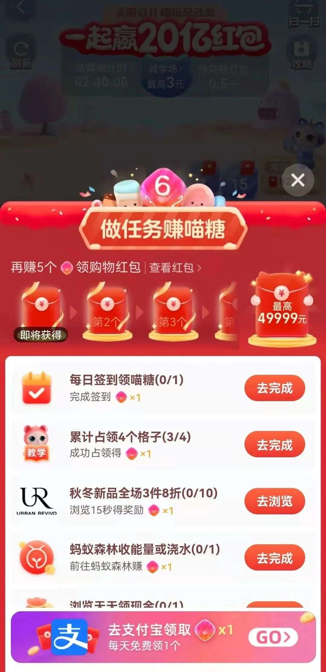 除了做指定任务,浏览指定页面15秒就能获得一颗喵糖。