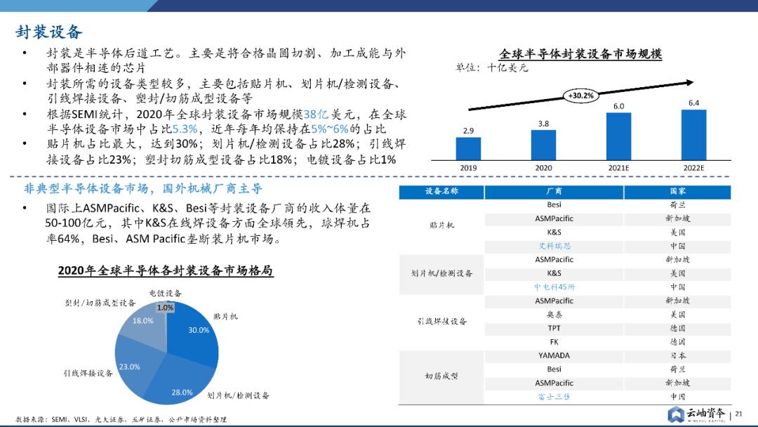 封装设备市场目前由国外机械厂商主导,ASMPacific、K&S、Besi等封装设备厂商的收入体量在50-100亿元规模,占据较多市场份额,基本上已完成全通道的打通。