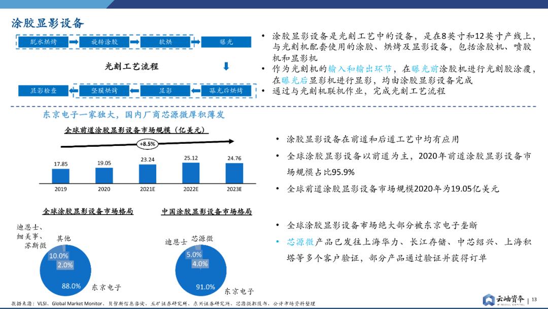 目前全球市场主要被东京电子垄断,国内,芯源微产品已在上海华力、长江存储、中芯绍兴、上海积塔等多个客户处有验证和导入。