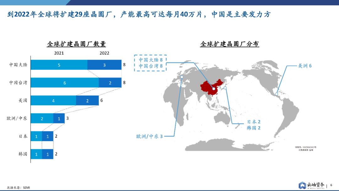 据SEMI统计,到2022年,全球将扩建29座晶圆厂,产能最高可达每月40万片。中国大陆和中国台湾将各扩建8座晶圆厂,是其中主要的发力方。