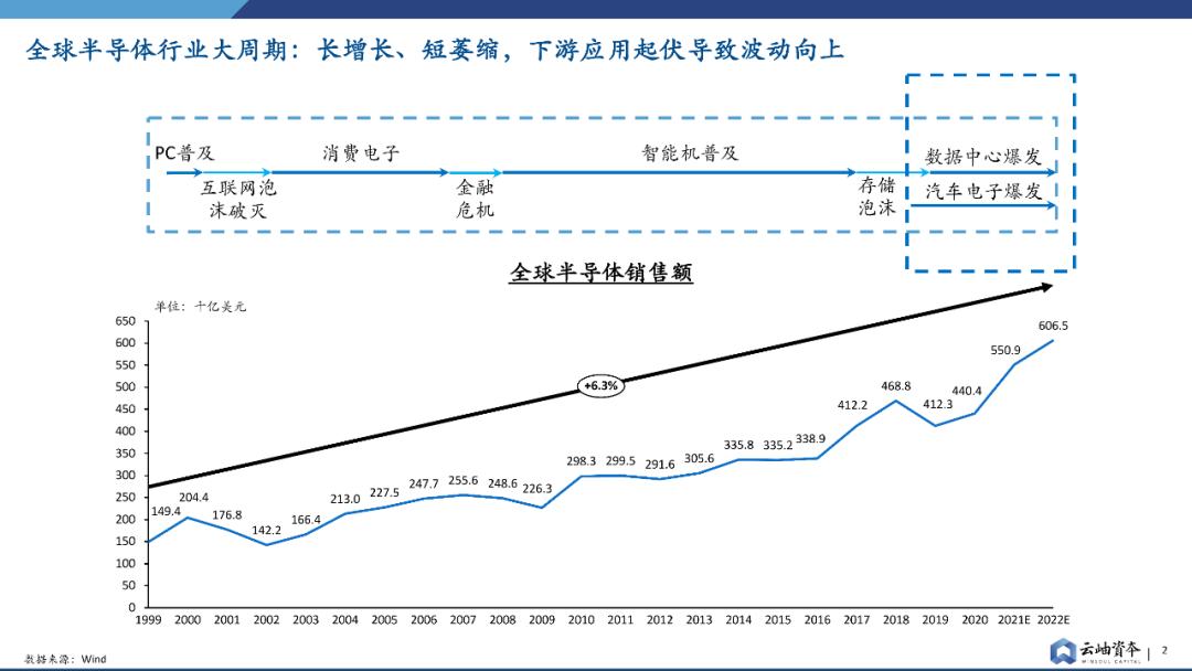 个人电脑的普及和互联网的涌现,MP3/MP4等消费电子的迭起,智能手机及移动互联网的浪潮,分别给半导体行业带来三段大增长周期。互联网泡沫、金融危机、存储泡沫也曾令半导体走入下行。2020年开始,全球半导体市场再次火热。