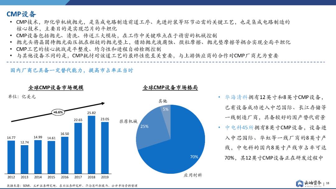 目前全球CMP市场规模在25亿美元左右,主要被AMAT和荏原机械垄断。国内厂商已具备一定替代能力:华海清科已有12吋和8吋的CMP设备,并已导入中芯国际、长江存储等一线制造厂商,中电科45所的8吋设备也已导入中芯国际、华虹等厂商的产线,国内CMP设备市占率提升正当时。