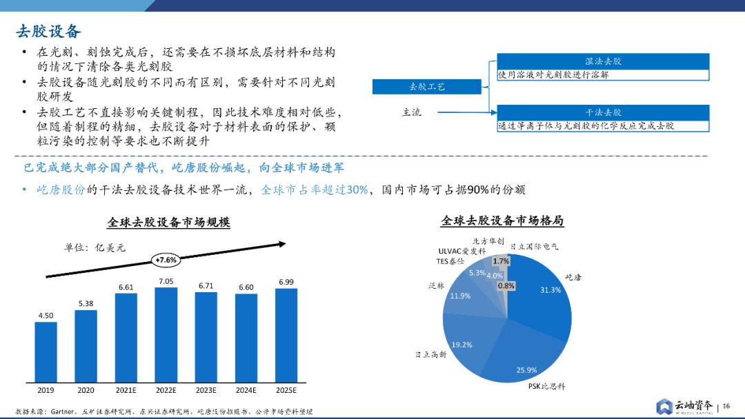 去胶设备市场相对较小,2020年全球市场规模为5.38亿美元。这个领域我国已完成绝大部分国产替代,屹唐的干法去胶设备更是世界一流,全球市占率超过30%。在国内则占据90%的市场。