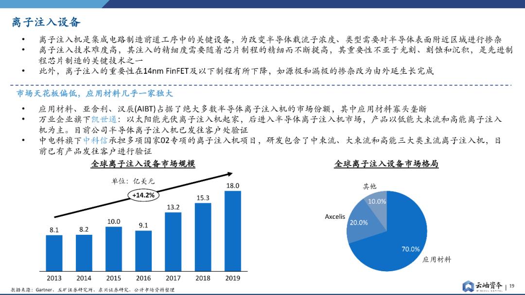 离子注入设备全球市场规模为20亿美元左右,市场天花板相对较低。目前应用材料、亚舍利和汉辰占据主要市场,其中应用材料一家独大,占据全球70%的市场份额。