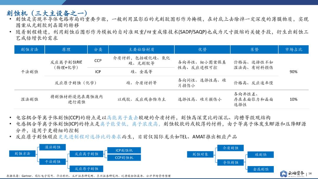 刻蚀可分为干法和湿法。干法刻蚀在整体市场占比最高,达到90%左右,可分为反应离子刻蚀(CCP、ICP)和反应原子刻蚀;湿刻只占了10%。