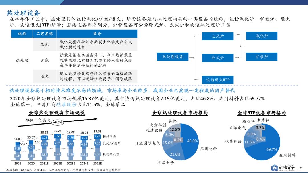 2020年全球热处理设备市场规模15.37亿美元,其中快速热处理设备7.19亿美元,占比46.8%。这个领域中,应用材料占比69.72%,全球第一;中国厂商屹唐股份占比11.5%,全球第二。