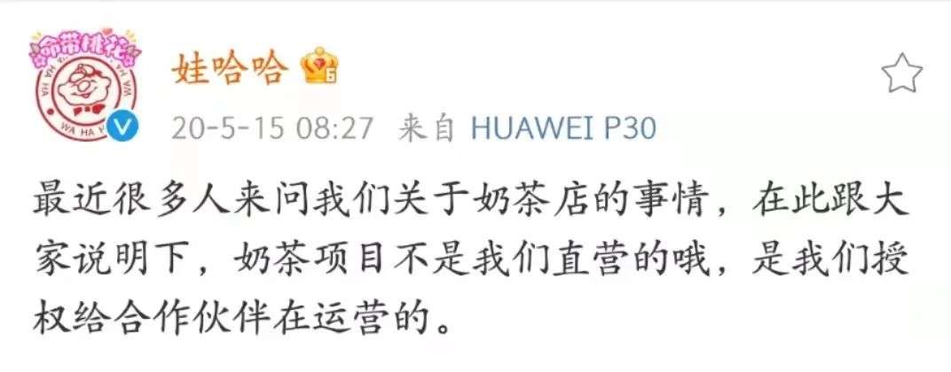 关于娃哈哈奶茶店的经营问题,其实早在去年娃哈哈官博就有声明:“最近很多人来问我们关于奶茶店的事情,在此跟大家说明下,奶茶项目不是我们直营的哦,是我们授权给合作伙伴在运营的。”