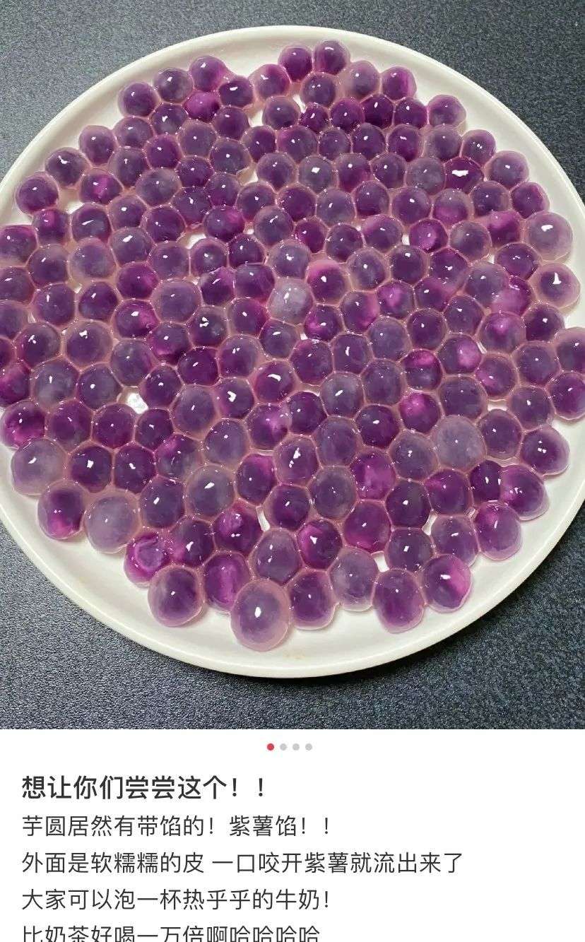 它像一颗颗小汤圆,又像“带馅的珍珠”,芋圆内包裹紫薯馅,煮好后晶莹剔透,淡紫色的外皮包裹深紫色的内馅,颜值非常高。