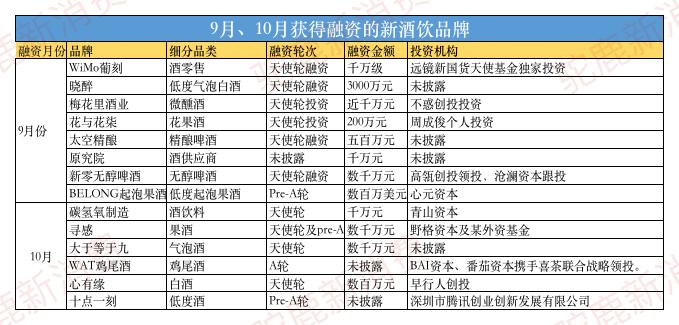 驼鹿新消费统计发现,9月和10月的融资案例中,只有花与花柒、寻感等品牌在花果酒细分领域,其他的品类就更多元化,气泡酒、无醇啤酒、精酿啤酒,白酒、鸡尾酒等,还有酒类零售渠道和供应商。