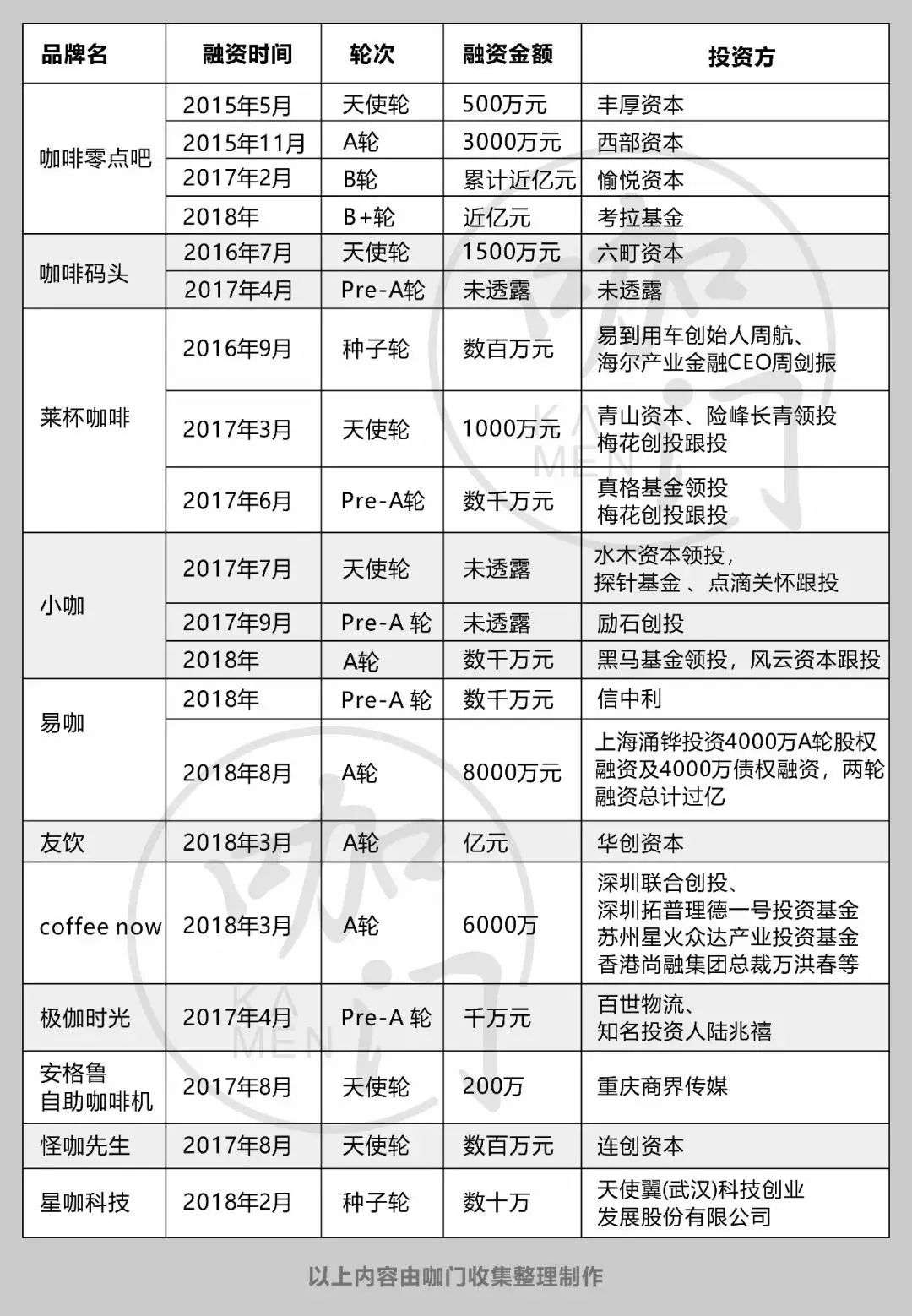 据不完全统计,2015年到2018年,3年时间,已有包括咖啡零点吧、咖啡码头、莱杯咖啡、易咖、小咖、友饮等不少于10个“自助咖啡”品牌获得融资。