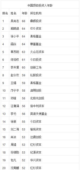 目前,中国创投圈活跃在一线的“高龄”投资人中,鼎晖投资的吴尚志68岁,熊晓鸽64,真格基金徐小平64,赛富基金的阎焱64,弘毅投资赵令欢56,沈南鹏52岁、张磊49岁,徐新55岁、肖冰53岁...据统计,占据中国创投榜前沿的著名投资机构大佬,有一半多已经进入知天命的年纪。