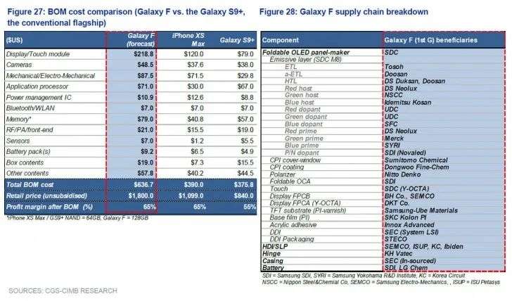 韩国咨询机构 CGS-CIMB 发布了一份关于初代 Galaxy Fold 的研究报告,其中估算了 Fold 的原料成本,并与同期的 Galaxy S9+ 和 iPhone XS Max 作比较。