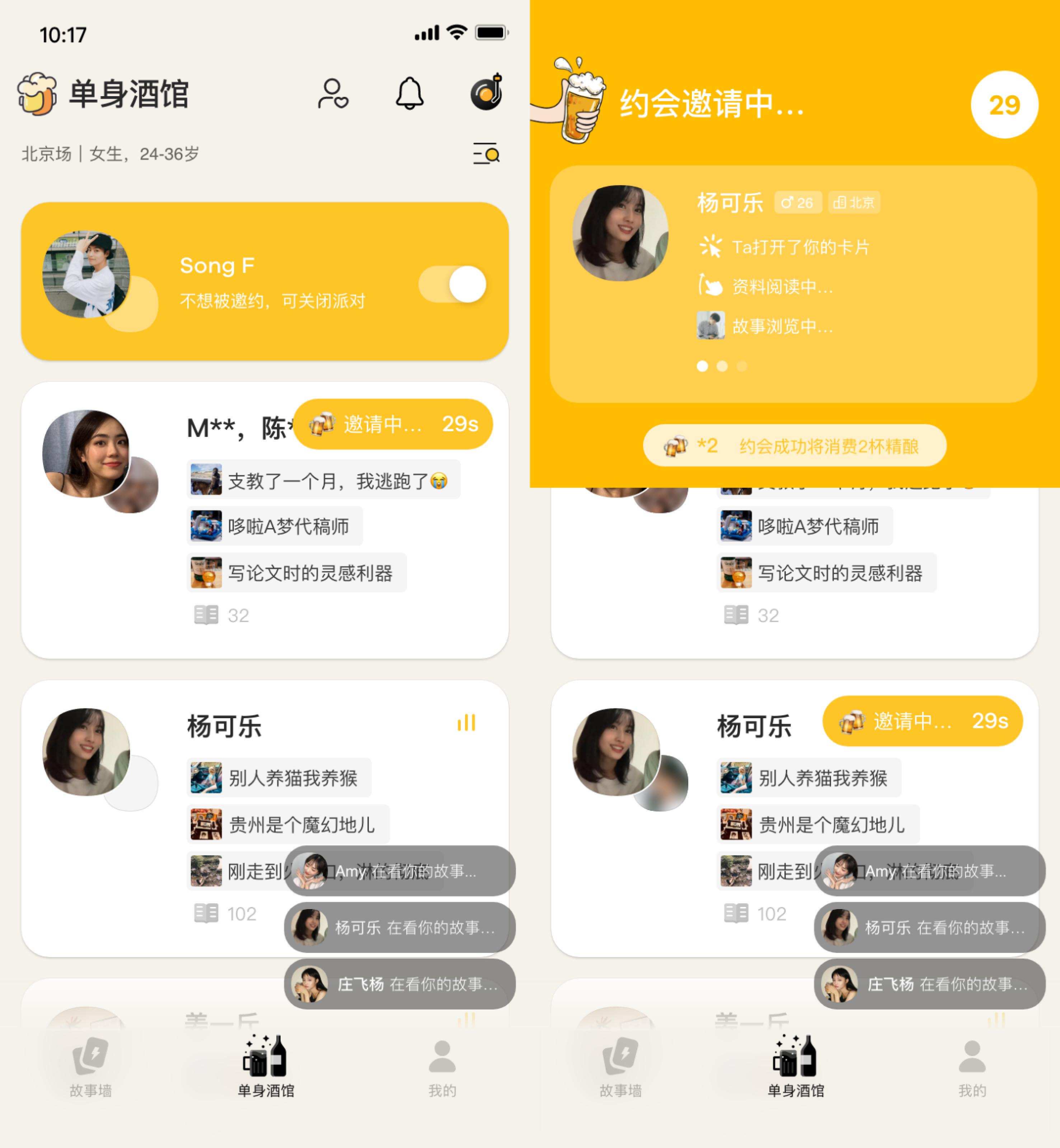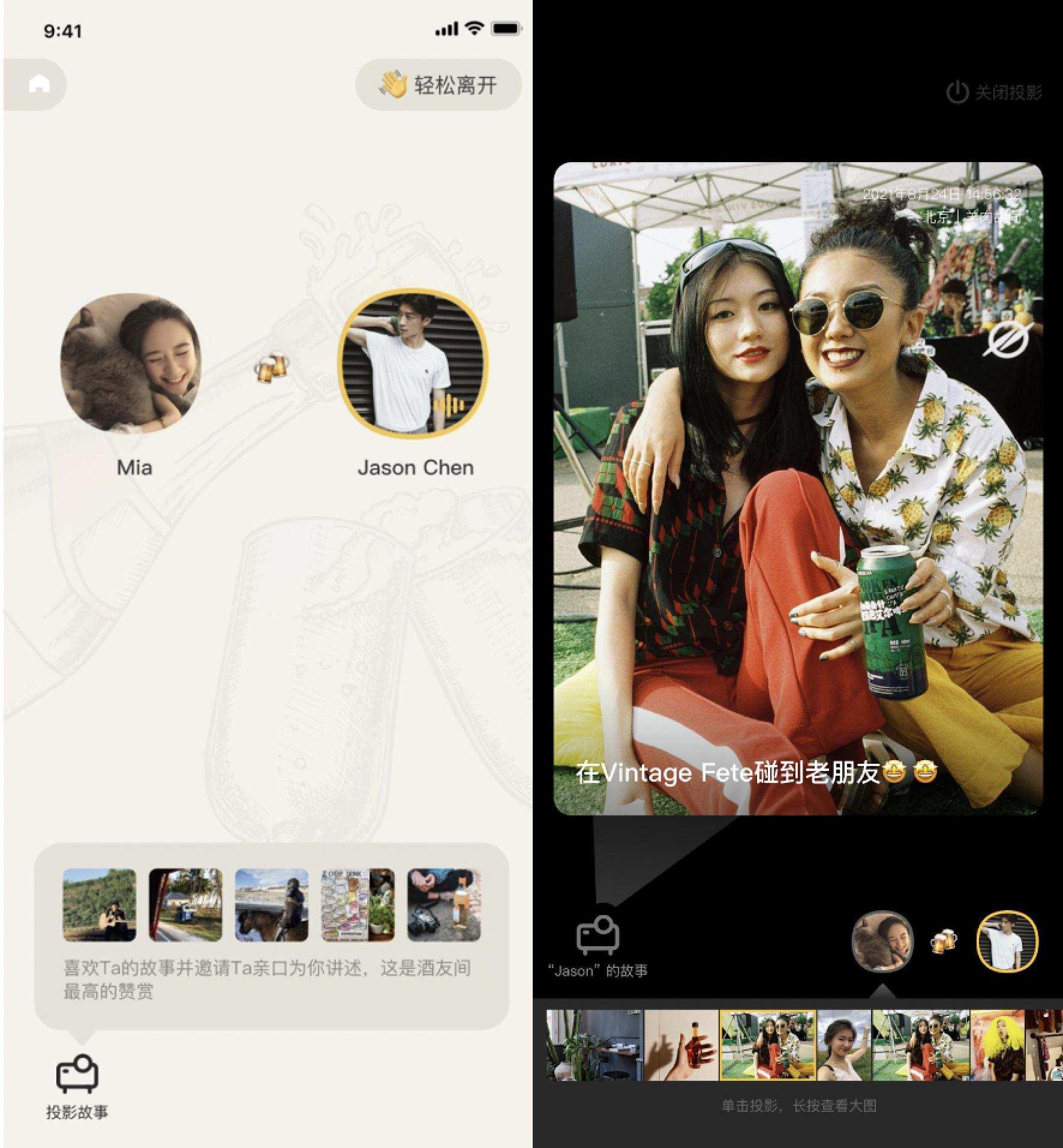 白天用户可以在故事墙选择自己感兴趣的人,提前预定约会;到了晚上十点,酒馆正式营业时则是另外一幅景象,进来会看到所有实时在线的人,只需一杯精酿便可向任何感兴趣的人发起约会邀请。在约会时,双方通过实时语音与投屏故事进行交流,也就是一张张个人照片,双方的对话也由此展开。