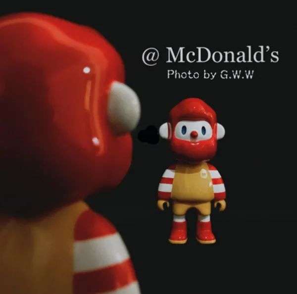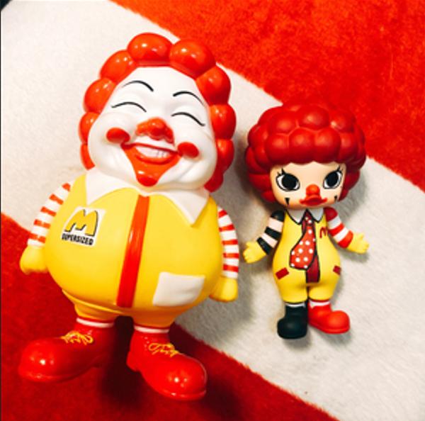在不少潮玩设计师们眼中,麦当劳元素可以说是“掌中宝”。不少改娃师、涂装师们根据时下流行的潮玩形象进行改造,把麦当劳叔叔“复刻”在新塑体上,成为新玩具和艺术品。比如Molly、Dimmo、SOOYA、FARMER BOB男友。