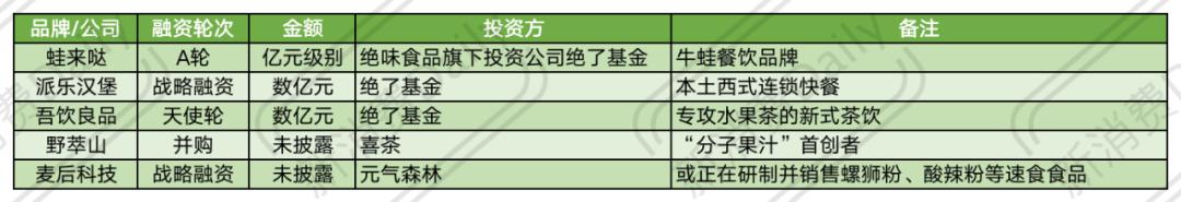 在下半年,我们能看到新品牌频繁作为资本入场,在食饮赛道中,喜茶11月并购了“分子果汁”首创者「野萃山」;元气森林入股了麦后科技,或研制并销售螺狮粉、酸辣粉等速食粉类食品。还有老品牌绝味食品更是在11月接连出手三个项目:蛙来哒、派乐汉堡、吾饮良品,且每一个项目融资都在亿元级别,后两者更是达到数亿元。