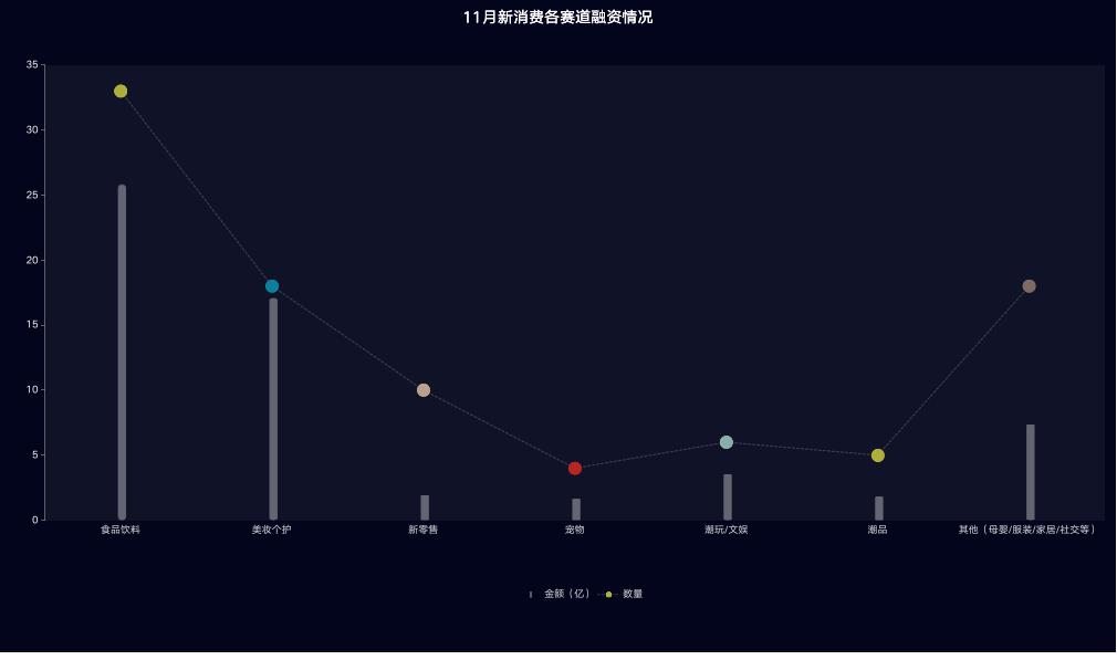 11月,食品饮料赛道融资33起,总金额达26.19亿(8轮融资未披露金额);而美妆个护赛道共发生18起融资,总金额达17.33亿,同样有8轮融资未披露金额。