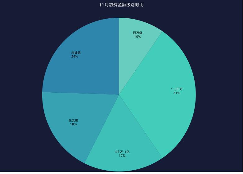 从融资轮次上来说,11月A轮数量与天使轮+种子轮相同。此前「新消费Daily」曾总结中提到过,资本对早期项目的谨慎度逐步提高,在前几个月,A轮系列的比重较天使轮越来越高。而11月的对等也并非是资本再度“疯狂”,而是新概念、新赛道效应初显。