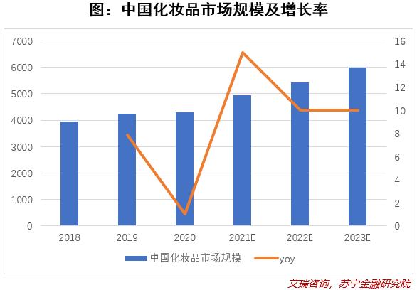 2020年,我国化妆品市场规模达到4300亿元,在疫情抑制需求的影响下仍能保持正增长。据艾瑞预测,未来三年,化妆品整体市场规模在疫情修复之后预计保持10%左右的增速持续增长,2023年有望达到6000亿元。