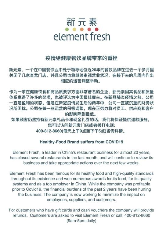 公开信的最后,新元素表示持有礼品卡和现金礼券的顾客,将保证提供退款服务。