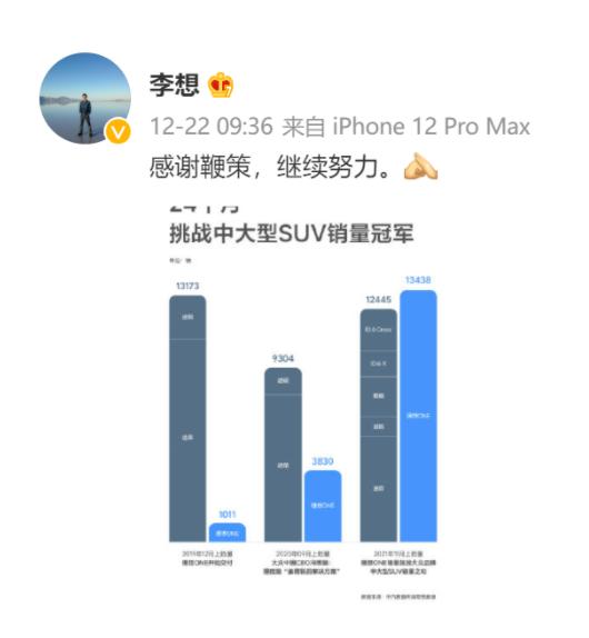 此时,小雷只在这份榜中看到了位列第二的途昂与位居榜首的理想ONE有着巨大的销量差距,并没有另作它想。12月22日,李想又发了一篇配文为“感谢鞭策,继续努力”的微博。然而,这短短8个字却让小雷感受到了它对大众持续时间长达一年的怨念与嘲讽。