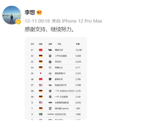 12月11日,李想发布的微博内容显示,理想ONE11月份销量达到了13438辆,位列当月中大型SUV销量榜榜首,上汽大众旗下的途昂则以5668辆,位居当月中大型SUV销量榜第二。
