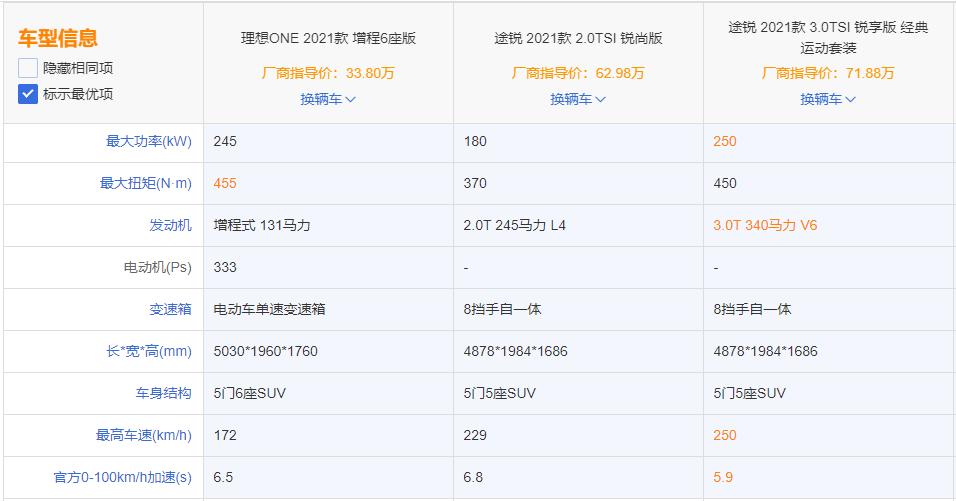 理想ONE虽然只搭载了一台1.2T的增程器,但是它的前后双电动机能够爆发出245kW的总功率,最大扭矩能够达到455N·m,0-100km/h加速时间为6.5秒,汽车之家认证车主平均油耗为8.8L/100km。通过对比之后我们就会发现,理想ONE的动力性能直逼大众3.0T,但是能耗还没有大众2.0T那么高。