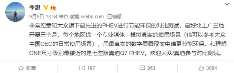 李想表示,可以用理想ONE与大众旗下两款代表顶级技术的奥迪Q7 e-tron,以及保时捷Cayenne E-Hybird进行实车对比评测,以证明孰优孰劣。有意思的是,李想敢说,还真就有看热闹不嫌事大的吃瓜媒体敢做。