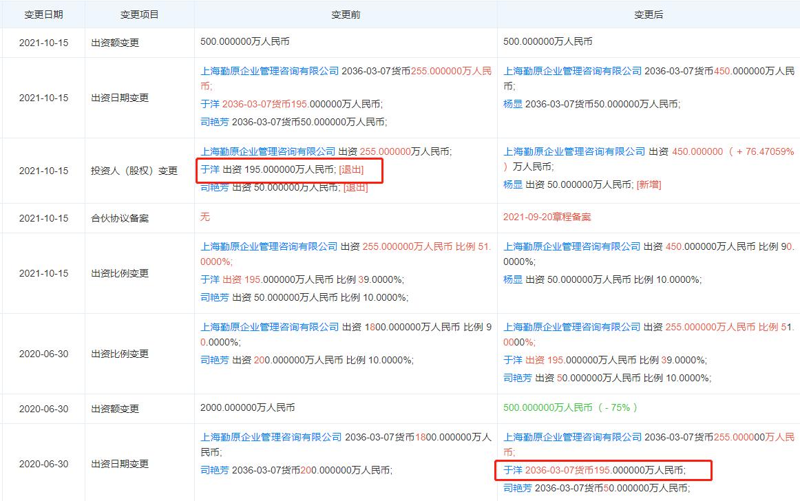 天眼查信息显示,2020年6月,于洋成为钦沐资产持股39%的重要股东,这个比例直到2021年10月,于洋退出时,才被改变。