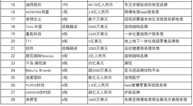 企业服务领域获得投融资的项目,主要关注营销获客、跨境电商、私域运营、智慧零售等问题。企服领域亿元级投融资6起,其中有3个是赋能跨境电商的项目,包括致力于通过“资本收购+品牌运营”模式帮助中国品牌在亚马逊平台获得成长的“Nebula Brands”、跨境电商SaaS服务商“ASINKING领星”、短视频赛道本地生活类服务新电商“食物主义”、智慧零售系统服务商“FLIPOS科技”、商户一站式数字化平台“富匙科技”和东南亚跨境电商商业解决方案服务商“来赞宝”。