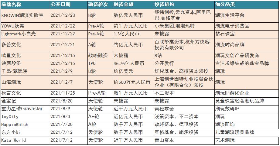 另外,一站式潮流生活平台“KNOWIN潮流实验室”,获得阿里巴巴领投,经纬创投、云九资本、真格基金跟投数亿人民币融资,据称,这是国内线下潮流业态金额最大的一笔融资。潮玩盲盒交易社区“千岛·潮玩族”,也在12月宣布了近亿美元的B轮融资,由红杉中国和高榕资本领投。