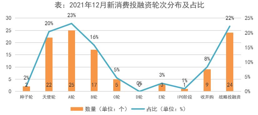 融资轮次上,A轮和战略投融资占比最高。A轮及以前投融资事件合计49起,占比达45%,低于11月份的62%;战略投融资事件24起,占比22%,高于11月份的15%;12月,B轮投融资事件17起,反观11月份,B轮投融资事件6起。处于IPO阶段的新消费投融资事件1起,专注实名制婚戒定制求(DR)的“迪阿股份”,12月15日在深交所上市。