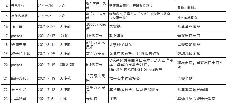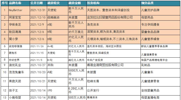 12月,新消费领域获得投融资的母婴相关项目5个,拿到亿元左右的母婴项目有2个。追溯到7月,2021年下半年以来,母婴相关的投融资项目有23起,母婴用品和婴童辅食/零食是关注重点。