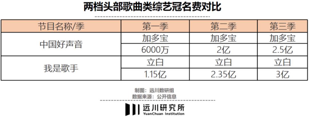 《中国好声音》首播一年后,《我是歌手》马上出现。它们的冠名费相差无几。