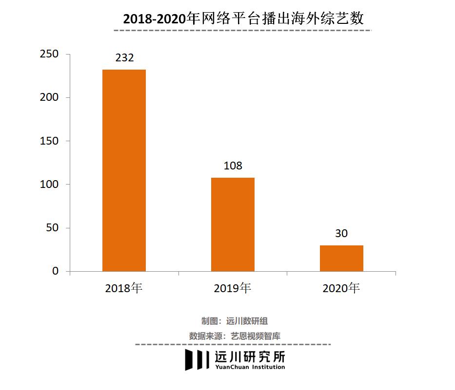 一方面,海外综艺数量急剧下滑,网络平台上海外综艺的数量从2018年的232部下降到了2020年的30部。留下的大多是头部综艺,并且改换了名字,比如《奔跑吧兄弟》改名《奔跑吧》,《我是歌手》改名《歌手》。