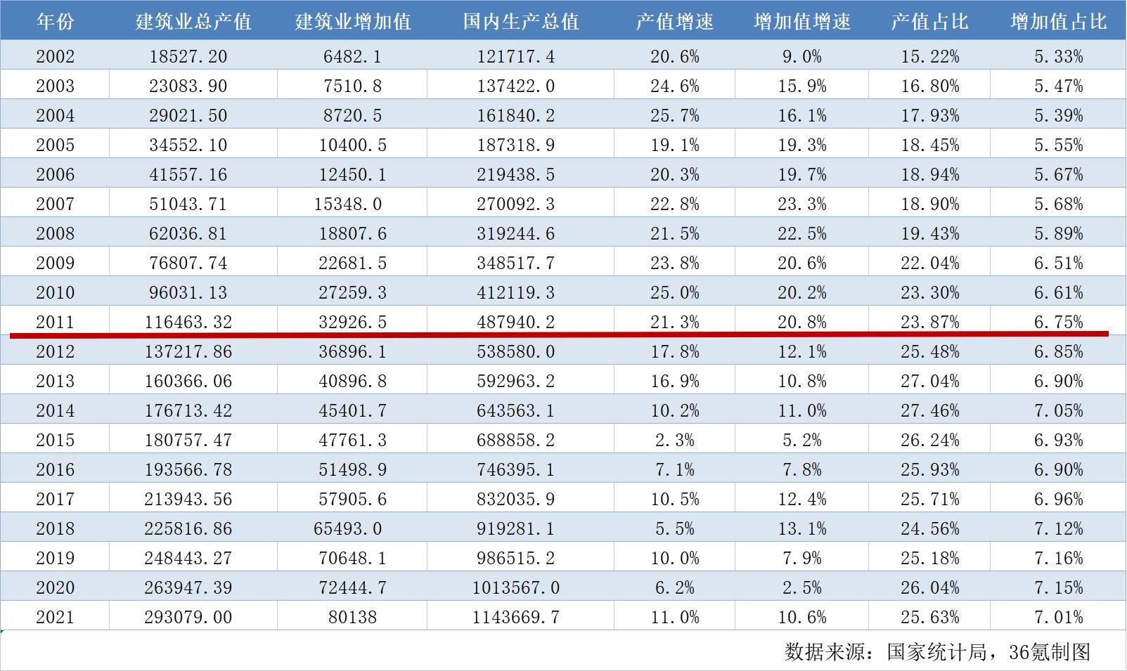 从近20年数据来看,建筑业增加值在2012年是个分水岭,前十年波动幅度较小,基本稳步上升,每年的平均增速为18.7%,后十年波动幅度较大,平均增速为9.4%,最低出现在2020年,为2.5%,最高是在2018年,为13.1%,低于前十年平均值。
