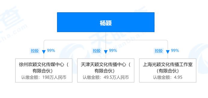 杨颖的关联企业显示共3家,包括上海光颖文化传播工作室(有限合伙)、徐州欢颖文化传媒中心(有限合伙)、天津天颖文化传播中心(有限合伙)。