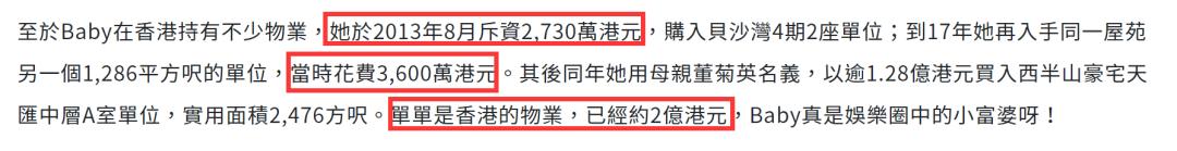 Angelababy则是将自己的物业大多集中在香港,2017年4月,Angelababy以母亲董菊英的名义斥资1.28亿元买入昔日亚洲第一豪宅高层,买楼大手笔让人侧目。其名下房产, 仅是在香港的房产就已经约2亿元港币(约合人民币1.7亿元)。