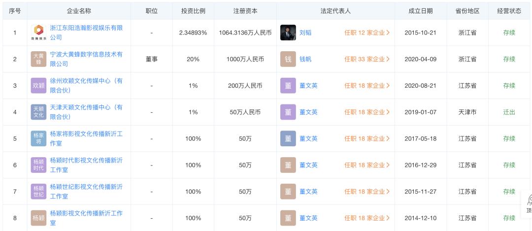 天眼查显示,董文英曾任职18家企业,担任15家公司法人,其中11家仍处于存续、在业、迁出状态。与其关联的公司中,多与杨颖有关。