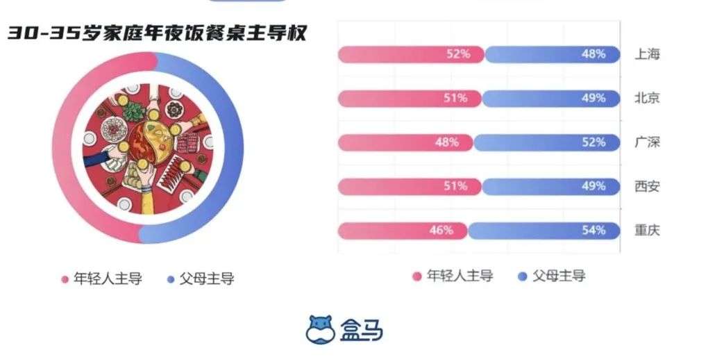 以前年夜饭的决策权常年都在50-60岁的老一辈人手中。随着社会发展、变迁,年轻人在大家庭中的越来越有“当家”趋势。 根据盒马年菜市场调研结果显示,现在30-35岁年轻人正在接过年夜饭的主导权,而这部分消费群体更愿意尝试预制年菜。