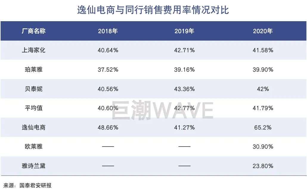 当然,惊人的速度对应的投入也是惊人的。2018年至2020年,逸仙电商在销售及营销上的花费分别是3.09亿元、12.51亿元、34.12亿元,最高比例已占到总营收的65.2%。