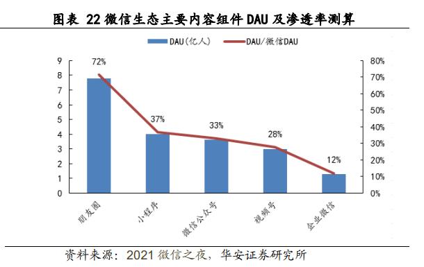 比如在微信近11亿社交流量中,同属于社交场景的朋友圈功能渗透率最高,拥有近72%的渗透率,2021年底DAU达到7.8亿。其他基于社交场景较为成功的组件功能,比如商业化组件小程序、内容组件公众号/视频号,渗透率均低于50%。