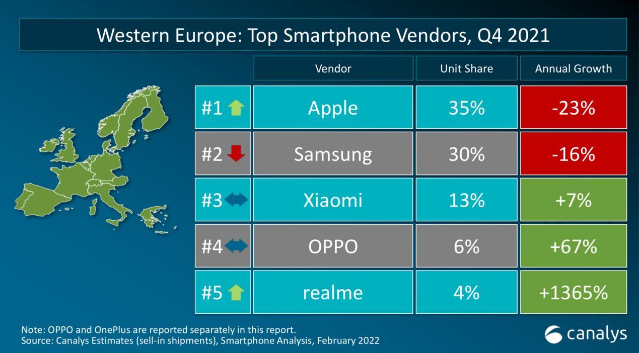 Canalys:realme的市场份额在全球30个市场和6个地区排名前五