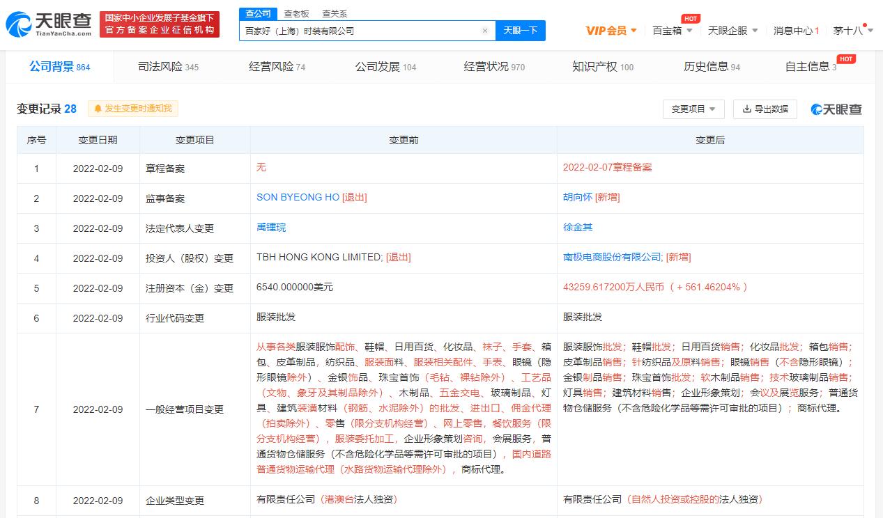 36氪获悉,天眼查App显示,2月9日,百家好(上海)时装有限公司发生多项工商变更,原股东TBH HONG KONG LIMITED退出,新增股东南极电商股份有限公司;法定代表人变更为徐金其;注册资本增至约4.33亿人民币,增幅超561%。百家好(上海)时装有限公司经营范围含服装服饰批发;珠宝首饰批发;软木制品销售等。