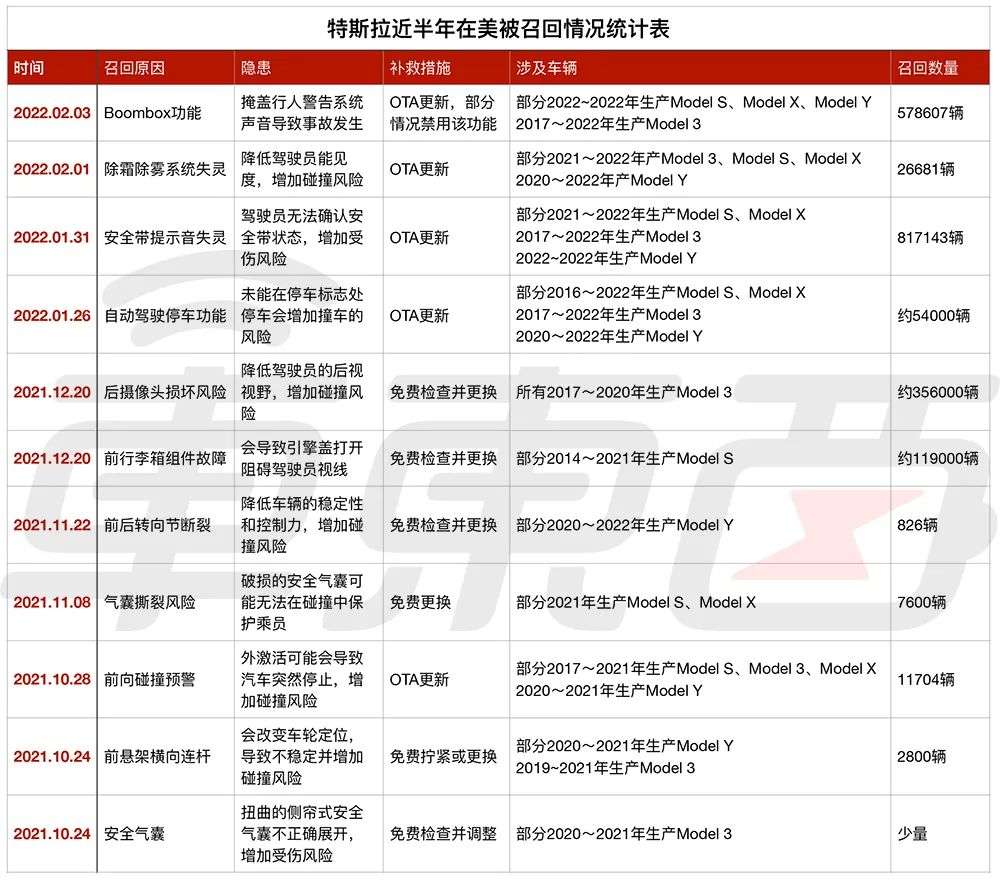 ▲特斯拉在美国召回情况统计表