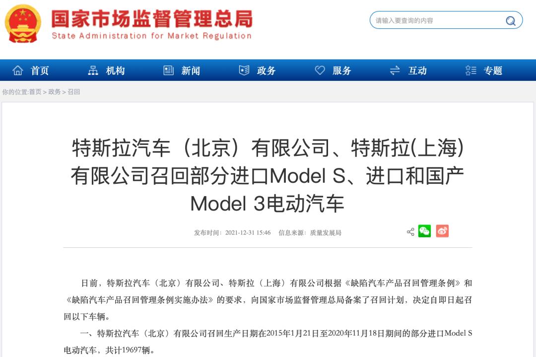 ▲国家市场监管总局对特斯拉召回信息的公布