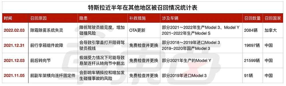 ▲特斯拉在其他地区召回情况统计表