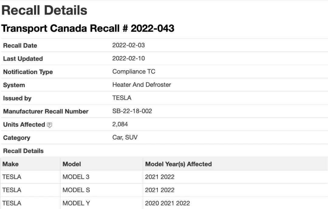 最近的一次发生在加拿大,也是在2月3日,加拿大交通部称特斯拉某些车辆在低温下可能会失去机舱加热功能,如果发生这种情况,挡风玻璃除霜和除雾系统可能无法正常工作,这将会增加撞车的风险。